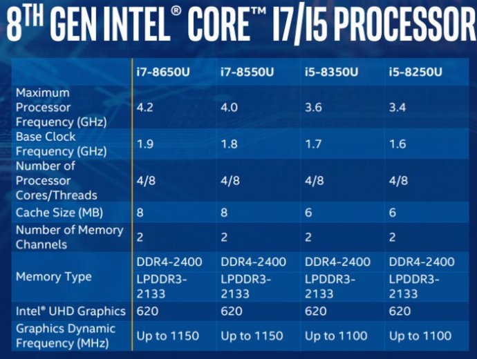 Новые процессоры Core восьмого поколения работают на относительно низких основных тактовых частотах (не выше 1,9 ГГц у старшей модели i7-8650U), благодаря чему все модели укладываются в термопакет (TDP) до 15 Вт при четырех вычислительных ядрах.