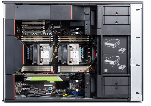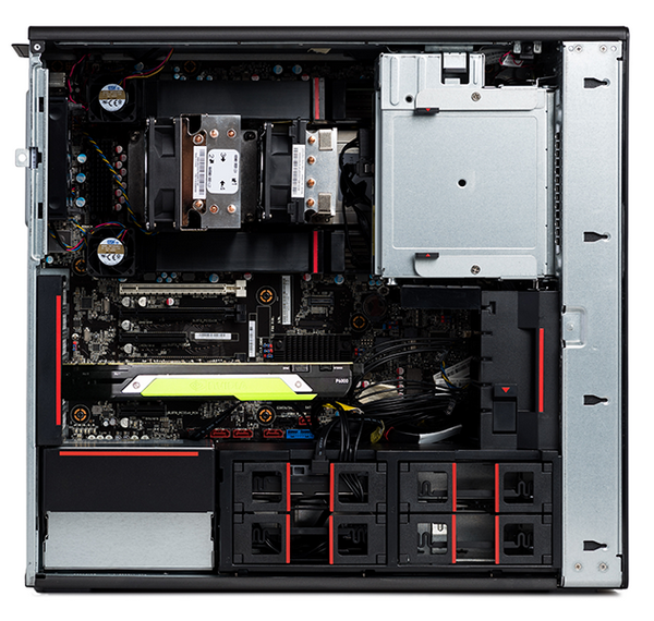 Вершина серии — ThinkStation P920. Эта модель также двухпроцессорная, но у неё более крупное шасси и специальная материнская плата, предусматривающая наличие 16 слотов DDR4 RDIMM ECC. Слотов PCIe x16 здесь целых пять, причём платы расширения могут располагаться как над, так и под процессорами. Дополнительно имеется три слота PCIe x4 и два разъёма M.2. Внутренние габариты корпуса и расположение слотов расширения позволяют без труда разместить три двухслотовых графических карты вместо двух. Питает систему блок мощностью 1400 ватт.